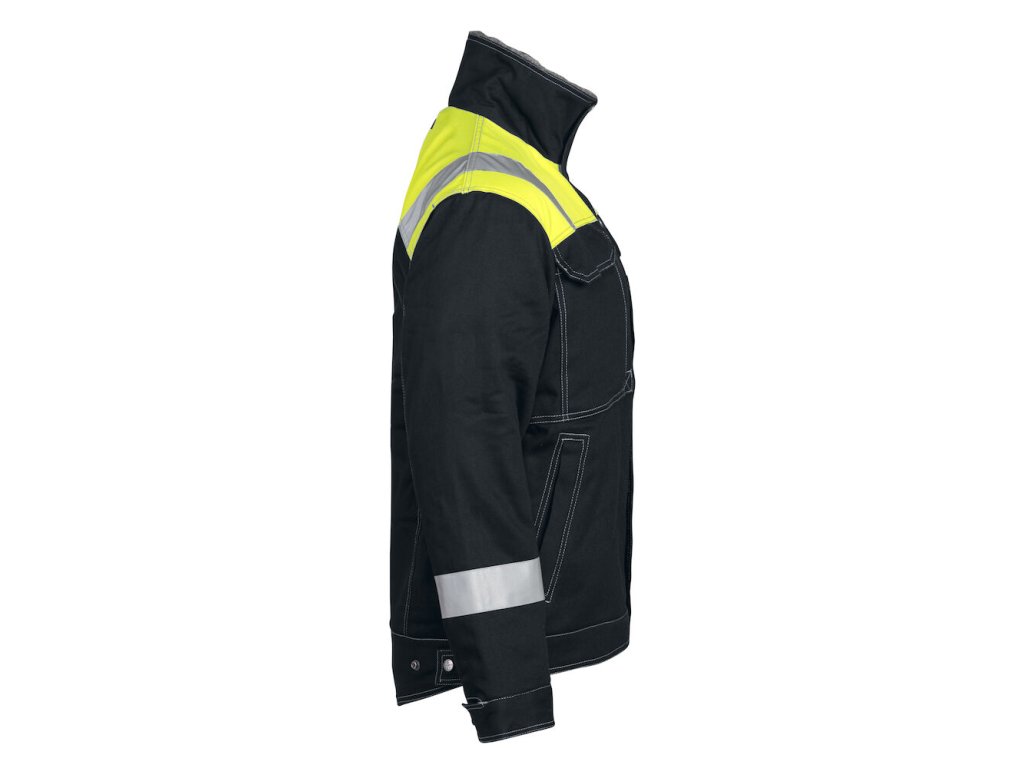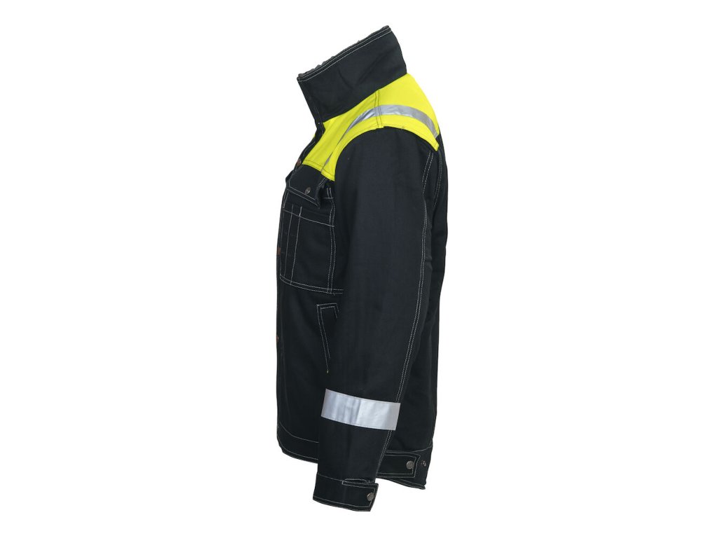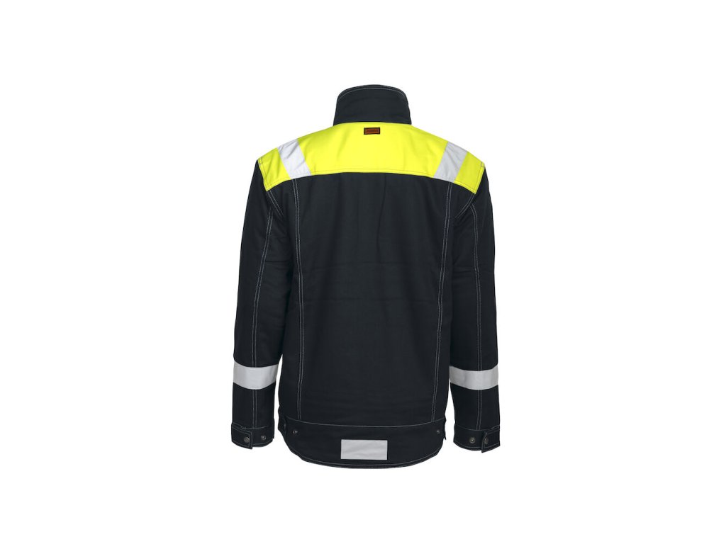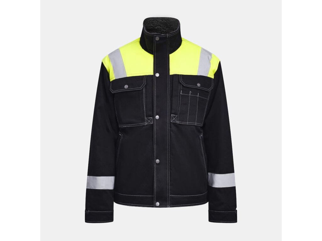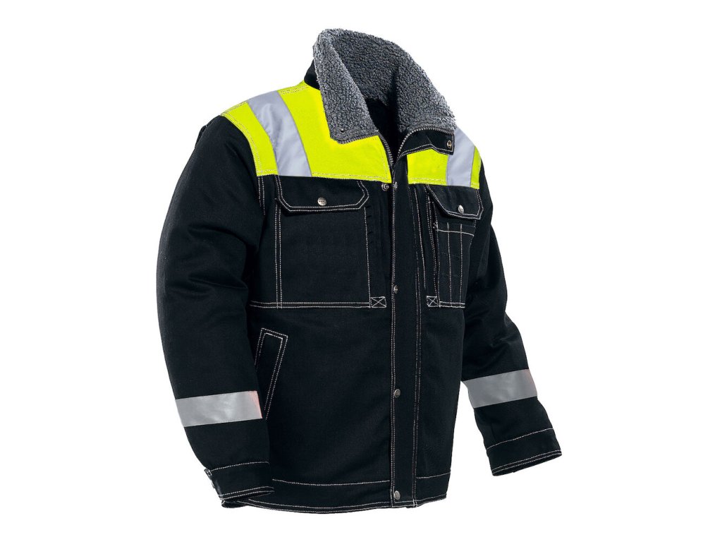 Zip s klopou přesahující k horní části límce. Vysoce viditelná tkanina na třmenu a reflexní prvky na rukávech.