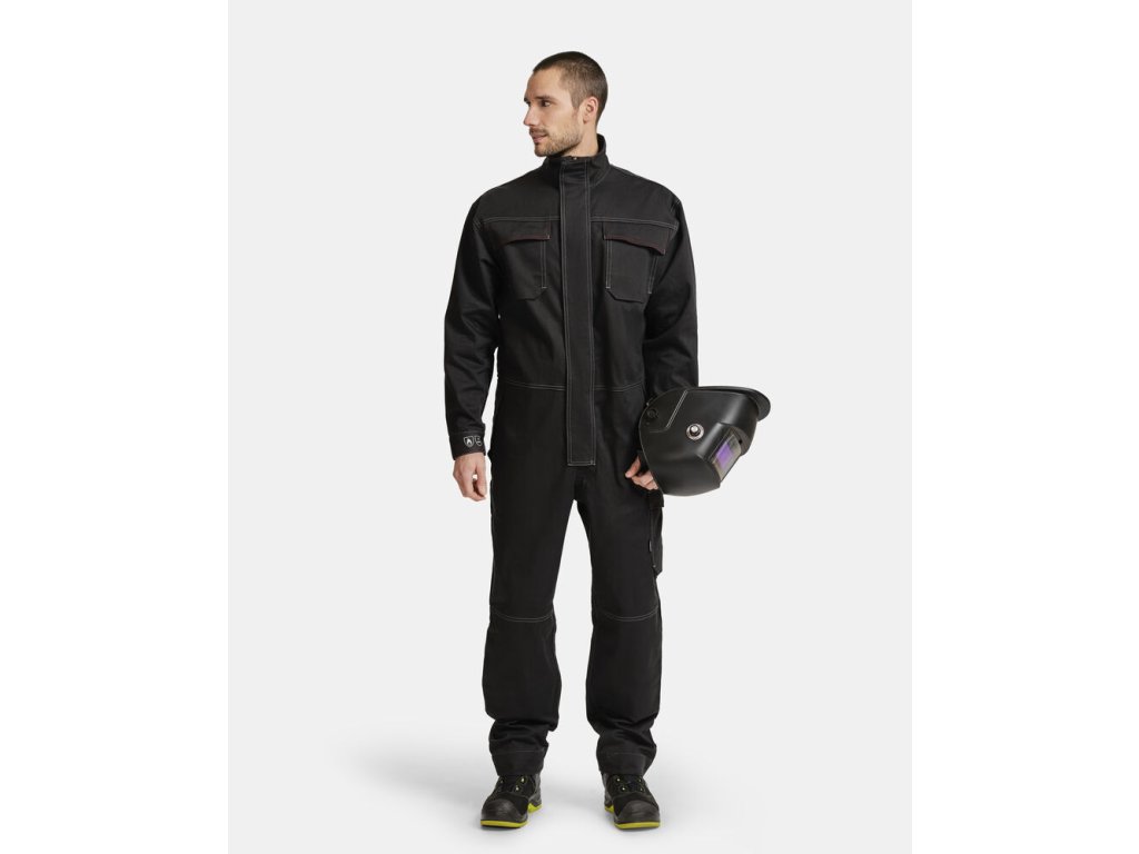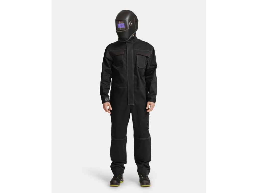 Kapsy a další doplňky jsou speciálně přizpůsobeny pro svařování. Vnější nákoleníky poskytují pohodlí a odolnost. Dvoucestný zip s klopou.