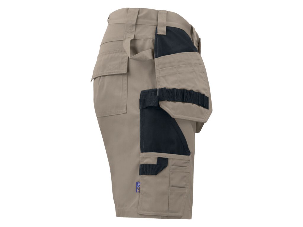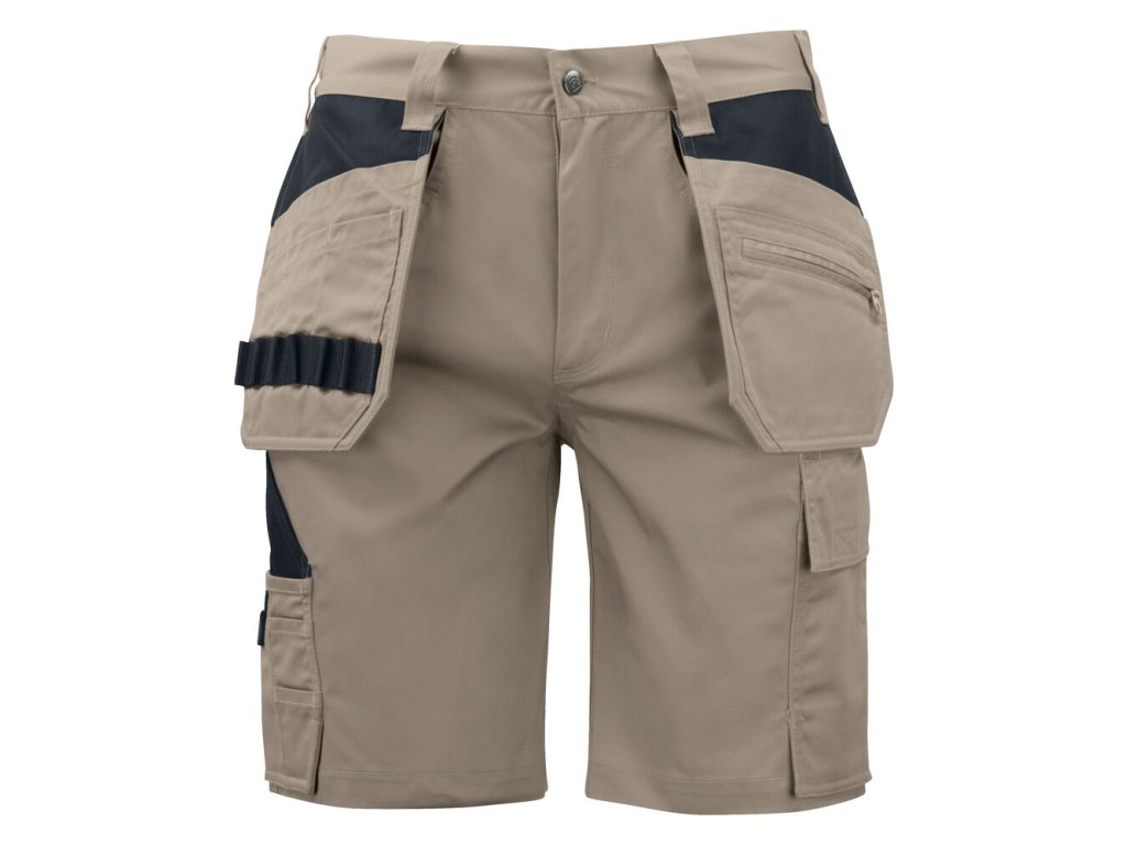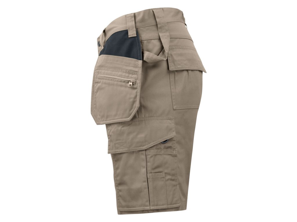 Pracovní kraťasy se dvěma závěsnými kapsami, které lze zastrčit do bočních kapes, jedna s přídavnou kapsou a jedna s poutky na nářadí. Zadní kapsy s klopou na suchý zip. Kapsa na skládací metr s knoflíkem na pracovní nůž. Vyztužení na kapse na skládací metr a na závěsných kapsách.