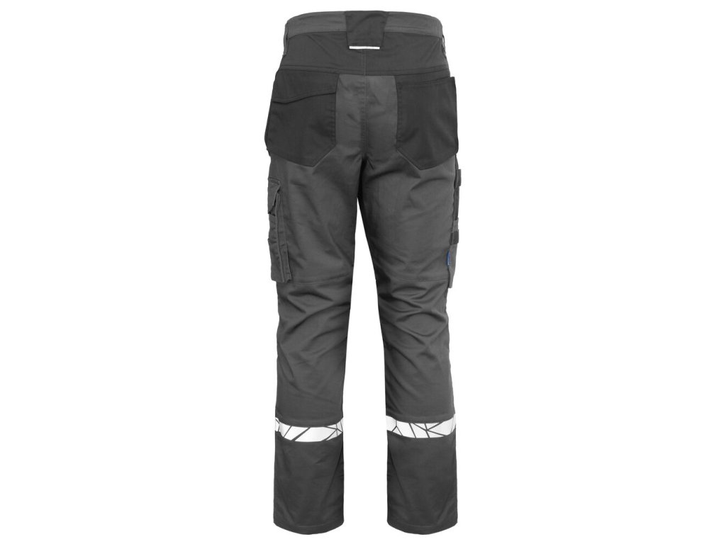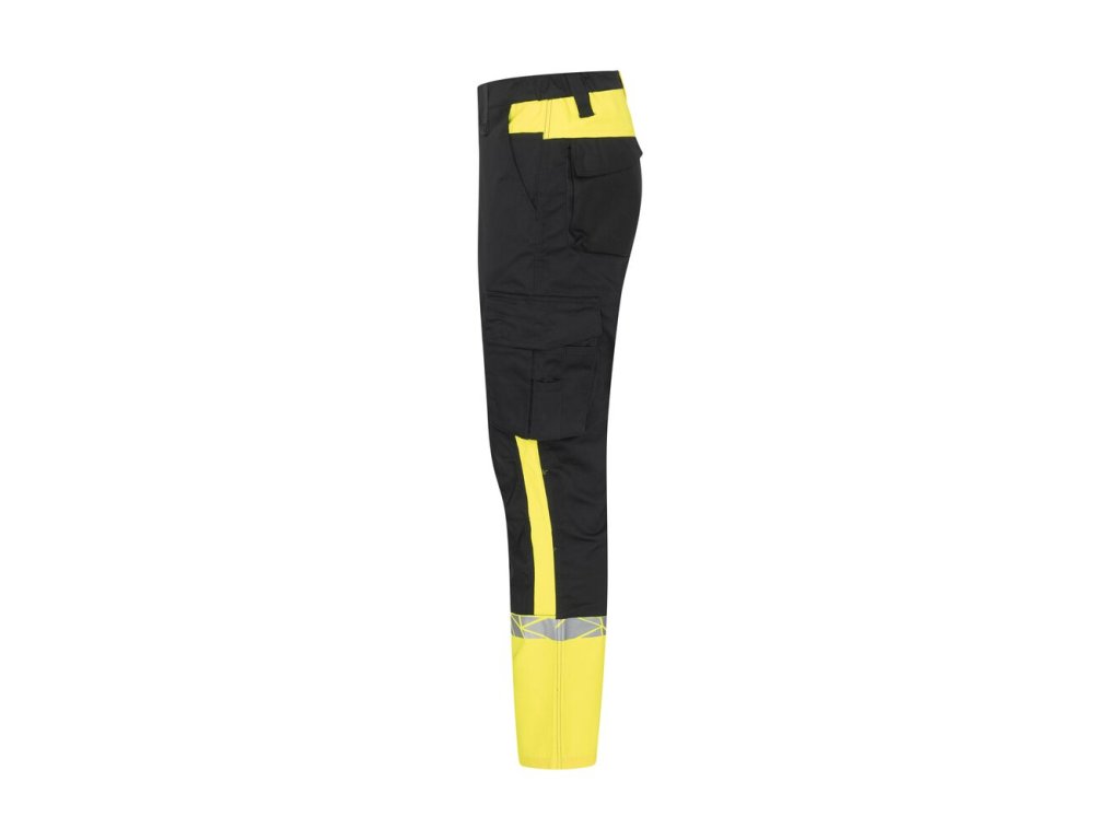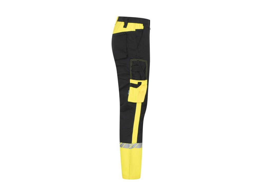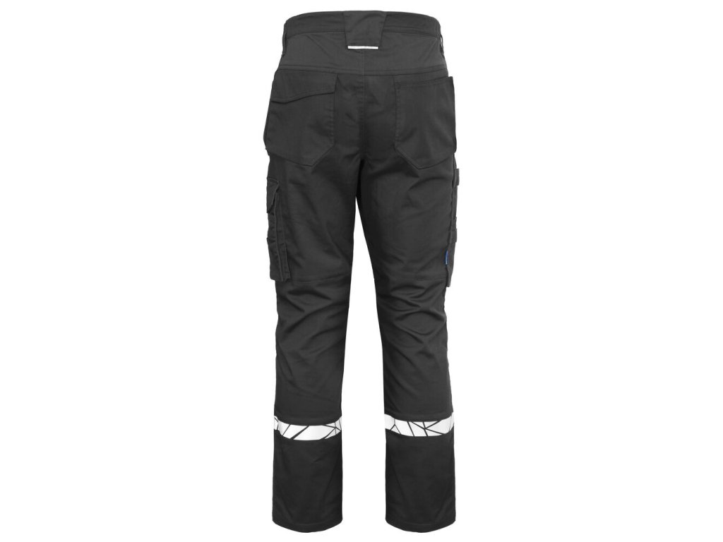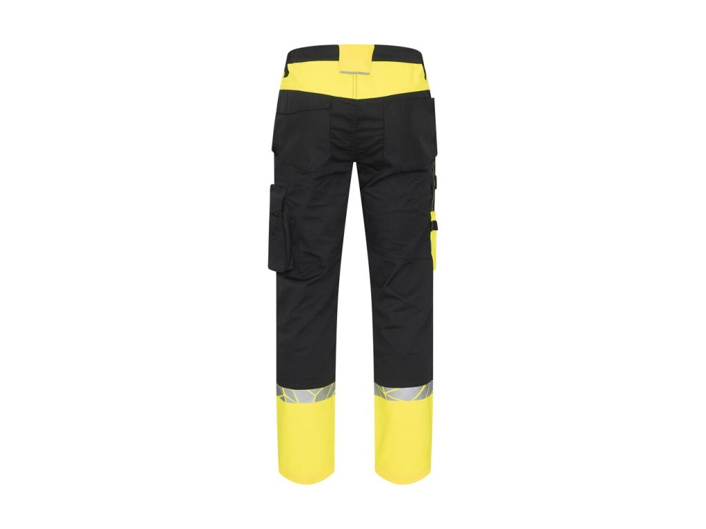 Skrytý knoflík vpředu. Výztuha v kapse na skládací metr, zadních kapsách a nad koleny pro zvýšenou odolnost. Testováno pro průmyslové praní dle normy ISO 15797 Zvýšená viditelnost EN 17353 Dodáváno v kompostovatelném sáčku na bio bázi.