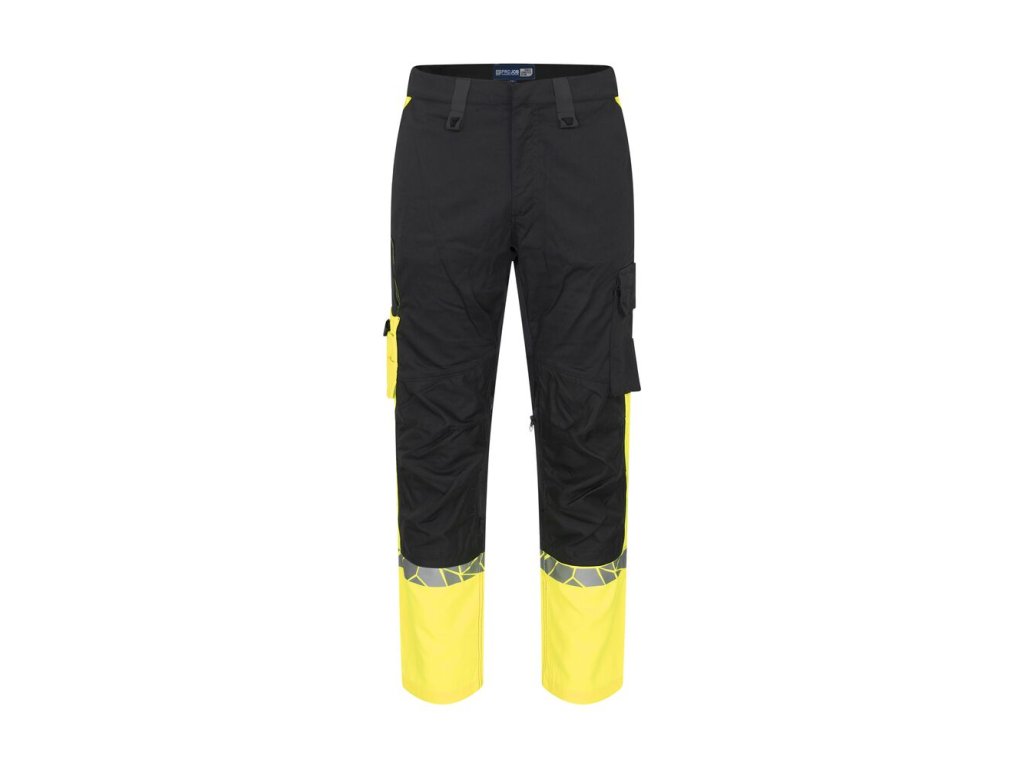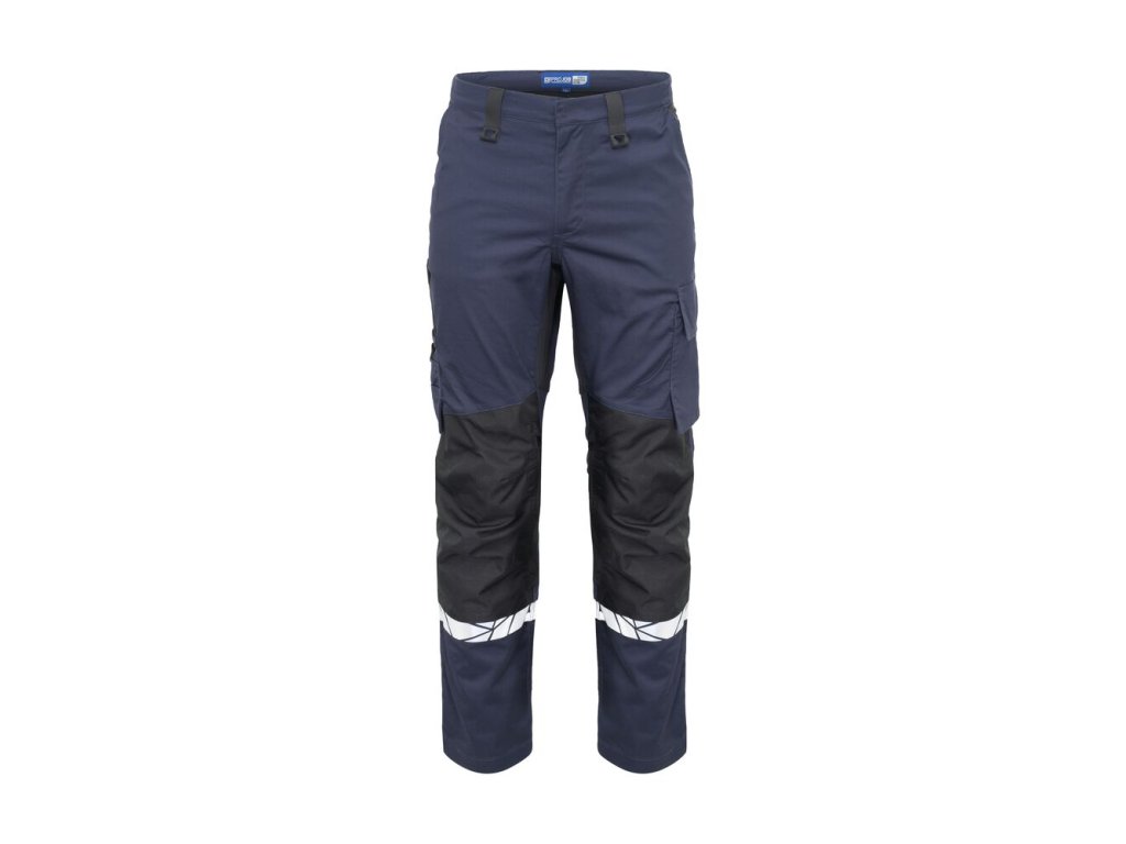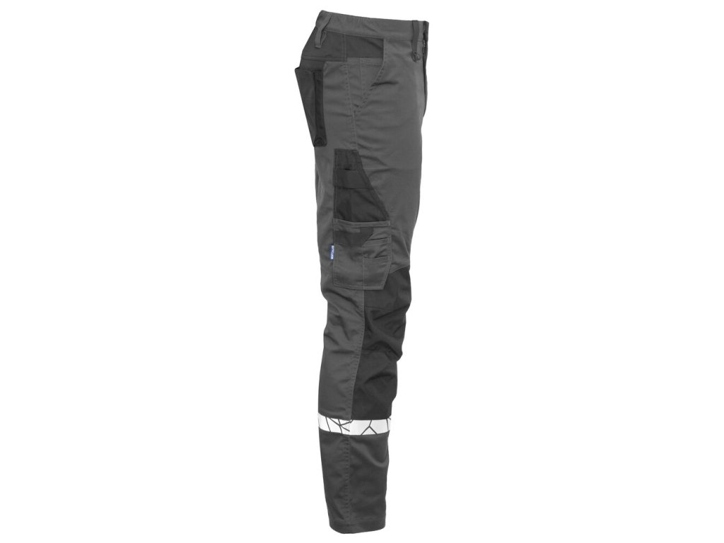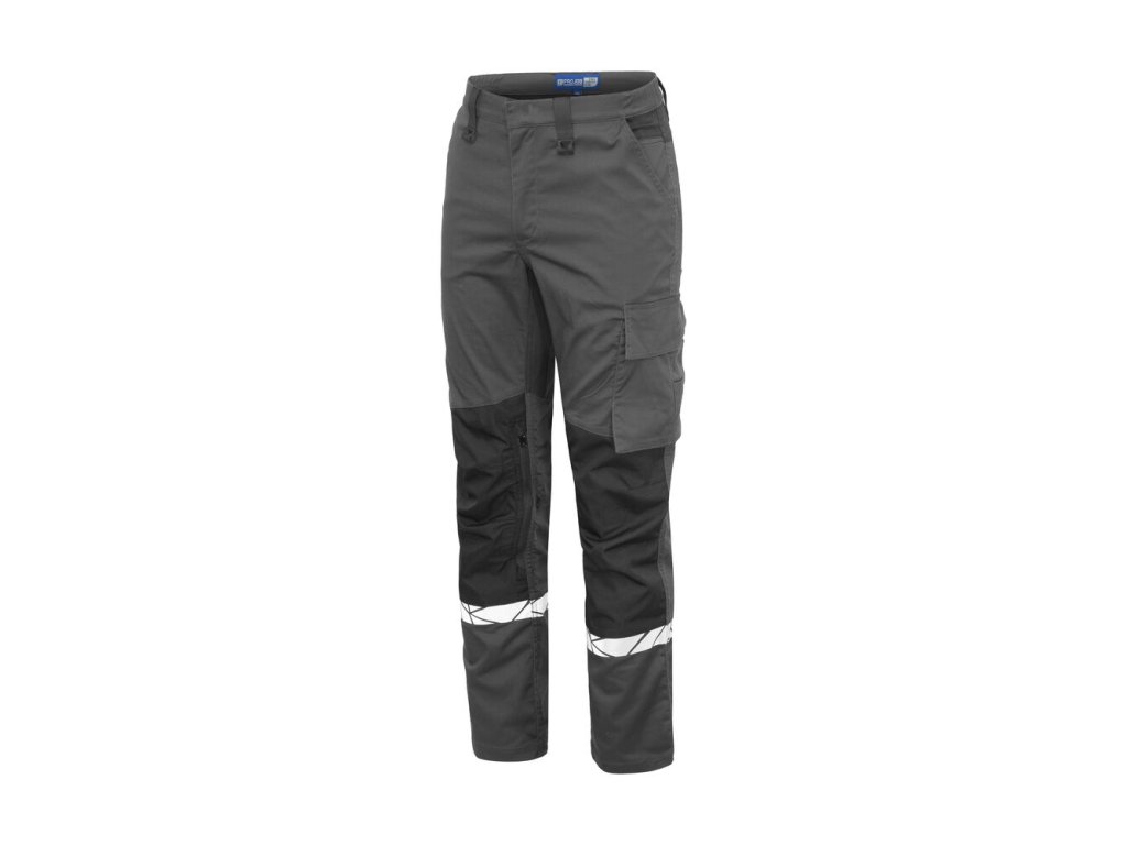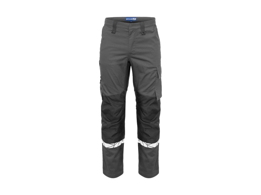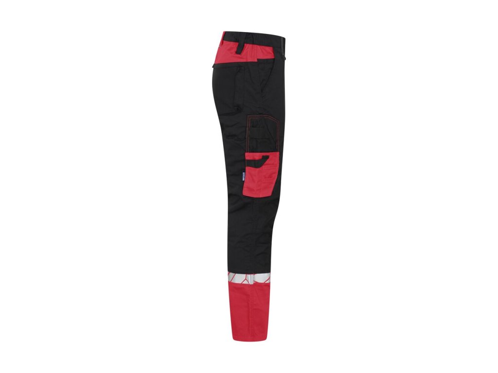 Skrytý knoflík vpředu. Výztuha v kapse na skládací metr, zadních kapsách a nad koleny pro zvýšenou odolnost. Testováno pro průmyslové praní dle normy ISO 15797 Zvýšená viditelnost EN 17353 Dodáváno v kompostovatelném sáčku na bio bázi.