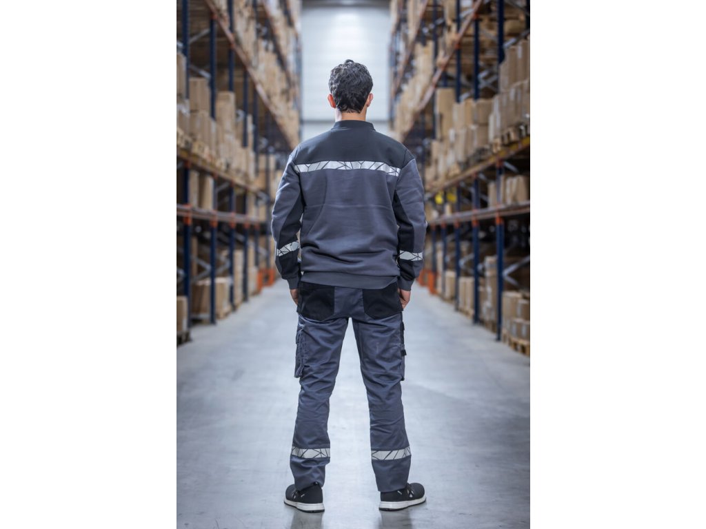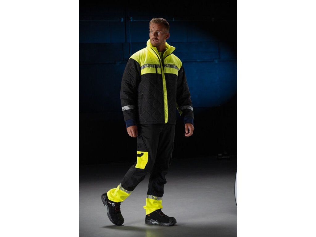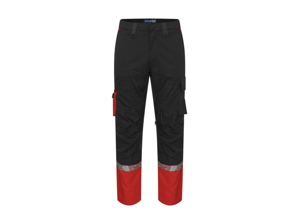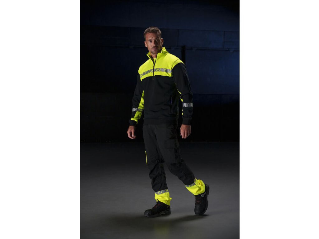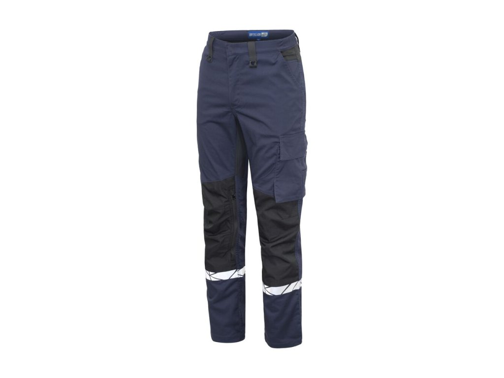 Skrytý knoflík vpředu. Výztuha v kapse na skládací metr, zadních kapsách a nad koleny pro zvýšenou odolnost. Testováno pro průmyslové praní dle normy ISO 15797 Zvýšená viditelnost EN 17353 Dodáváno v kompostovatelném sáčku na bio bázi.